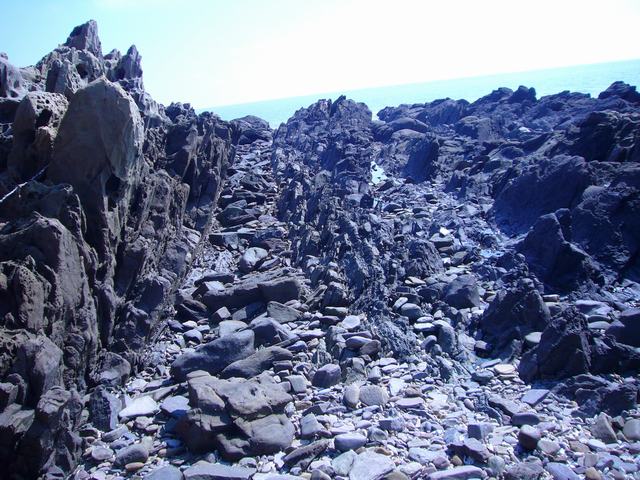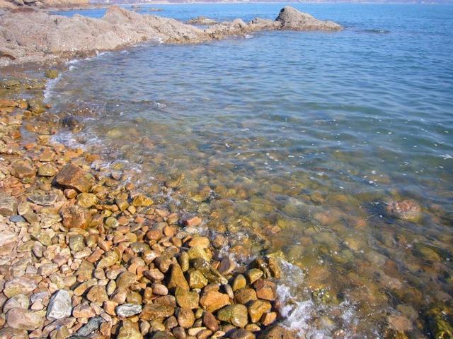 让我兴奋的是,久住山区终于见到了海边的礁石群和成片鹅卵石。那年坐船去南黄岛一趟,远远地就发现那个岛的四周围着一圈铅灰色的石头,待到近处一看,海蚀的作用,把岸边的礁石撞击得坑坑洼洼,形态各异,狰狞无比。退潮的时候,五颜六色的鹅卵石一圈又一圈,像泛着石头的波纹,围绕在大海的最边缘,越往边上越细,直到细如沙尘。时间,可以把坚硬无比的石头磨成齑粉。